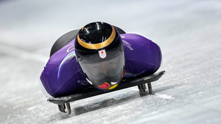 Japan's Hiroatsu Takahashi starts for a men's skeleton training session at the 2026 Winter Olympics, in Cortina d'Ampezzo, Italy, Monday, Feb. 9, 2026. Foto: SITA/AP.