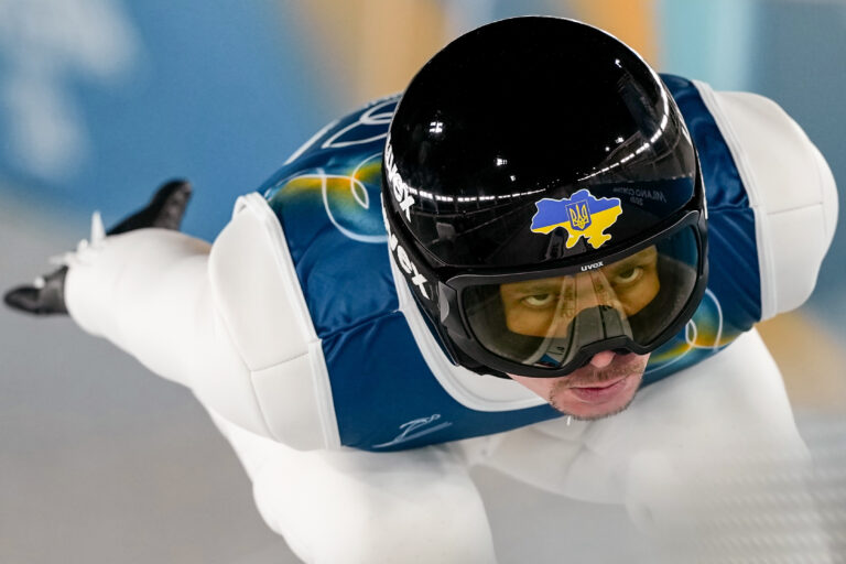 Vitaliy Kalinichenko, of Ukraine, goes down the ramp during his trial jump of the ski jumping men's normal hill individual at the 2026 Winter Olympics, in Predazzo, Italy, Monday, Feb. 9, 2026. Foto: SITA/AP.