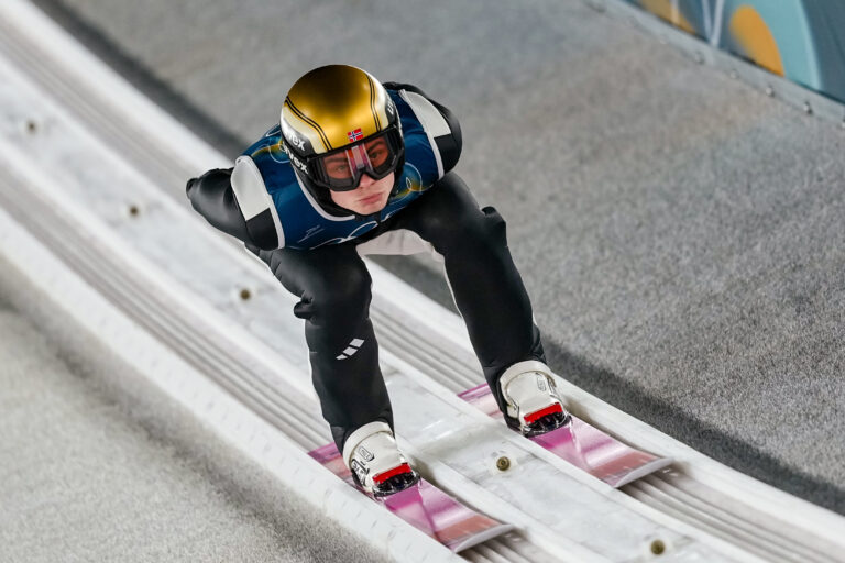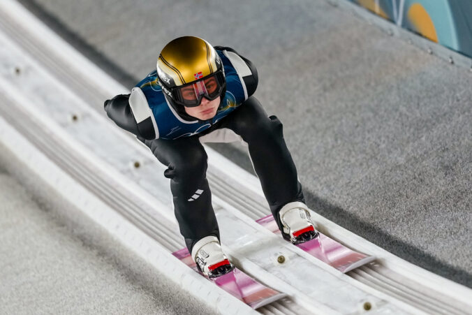 Marius Lindvik, of Norway, goes down the ramp during his trial jump of the ski jumping men's normal hill individual at the 2026 Winter Olympics, in Predazzo, Italy, Monday, Feb. 9, 2026. Foto: SITA/AP.