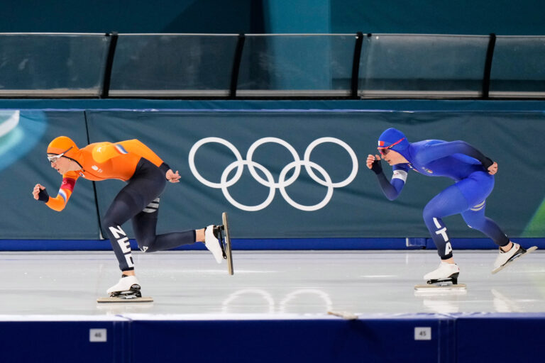 Suzanne Schulting of the Netherlands and Maybritt Vigl of Italy, right, compete in the women's 1,000 meters speedskating race at the 2026 Winter Olympics, in Milan, Italy, Monday, Feb. 9, 2026. Foto: SITA/AP.
