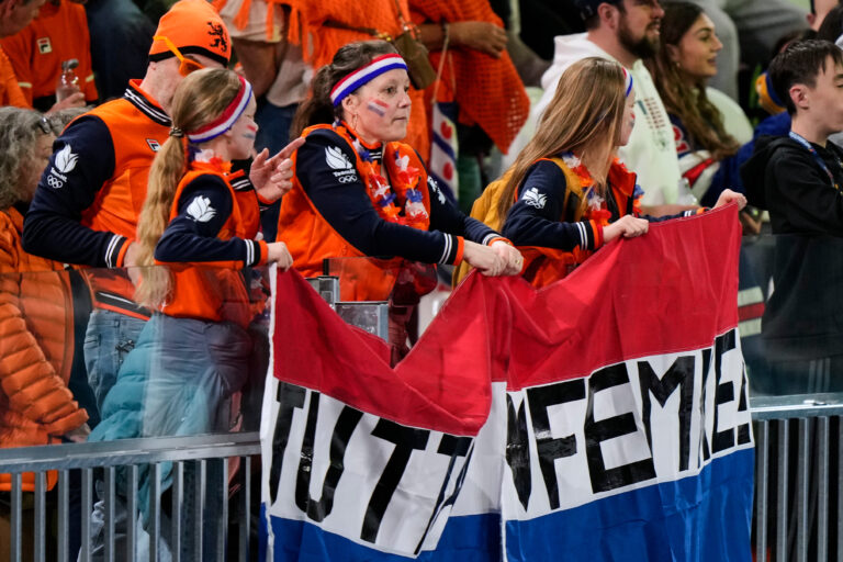 Dutch fans wait for the women's 1,000 meters speedskating race at the 2026 Winter Olympics, in Milan, Italy, Monday, Feb. 9, 2026. Foto: SITA/AP.