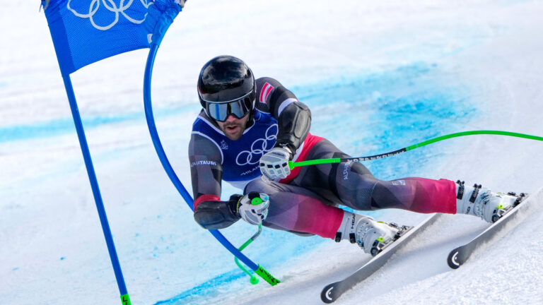 Austria's Vincent Kriechmayr speeds down the course, during a men's super-G race, at the 2026 Winter Olympics, in Bormio, Italy, Wednesday, Feb.11, 2026. Foto: SITA/AP