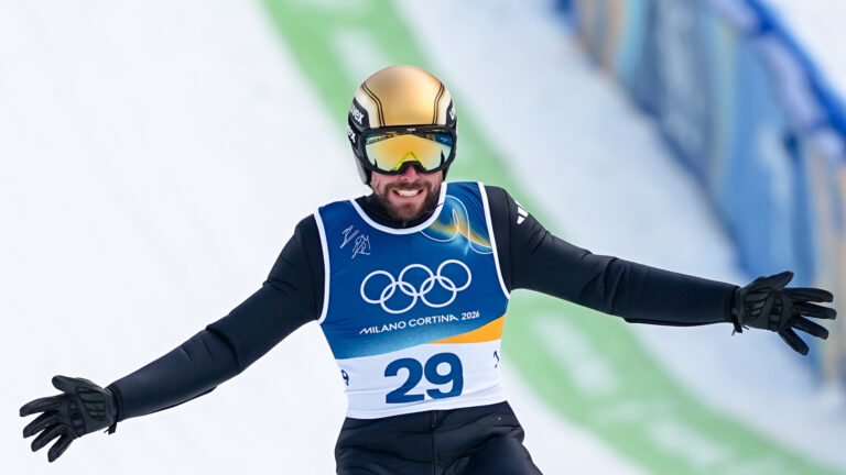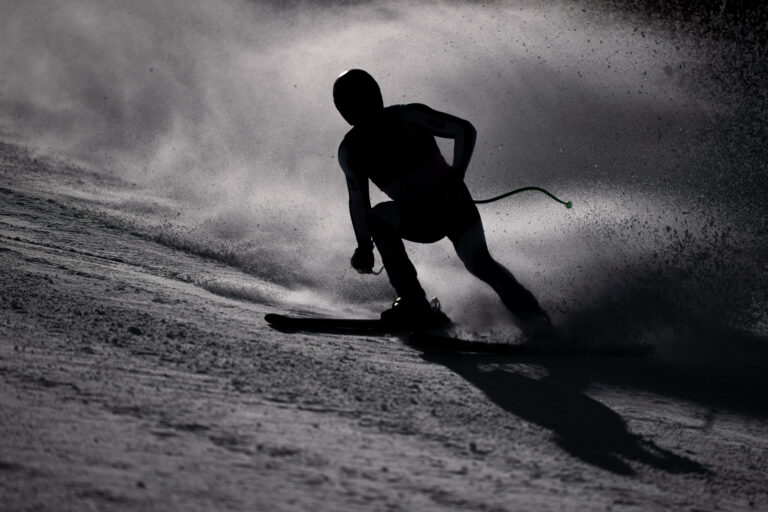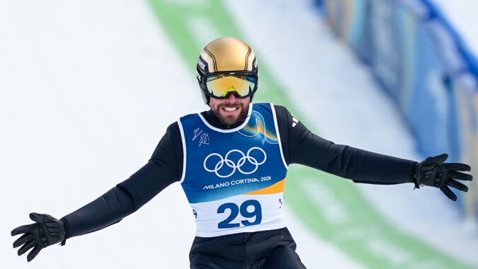 France's Nils Allegre is silhouetted as he arrives at the finish area during a men's super-G race at the 2026 Winter Olympics, Wednesday, Feb. 11, 2026, in Bormio, Italy. Foto: SITA/AP