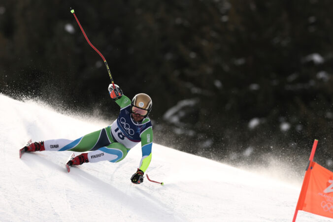 Slovenia's Miha Hrobat speeds down the course during an alpine ski, men's super-G race, at the 2026 Winter Olympics, in Bormio, Italy, Wednesday, Feb. 11, 2026. Foto: SITA/AP