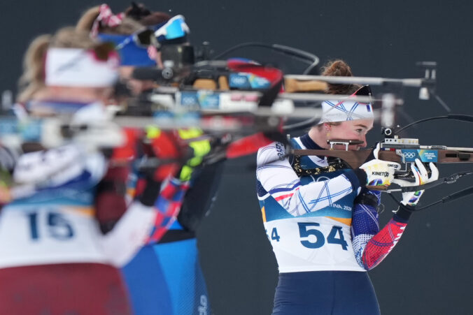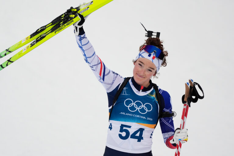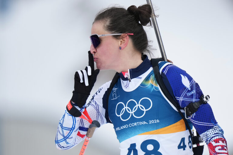Julia Simon, of France, gestures after competing in the women's 15-kilometer individual biathlon race at the 2026 Winter Olympics in Anterselva, Italy, Wednesday, Feb. 11, 2026. Foto: SITA/AP