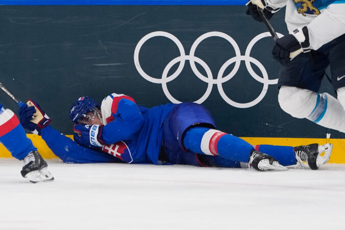 Otrasený slovenský útočník Martin Pospíšil po tom, čo ho v tretej tretine zápasu proti Fínsku v základnej B-skupine na zimnej olympiáde do tváre lakťom trafil Rasmus Ristolainen. Miláno (Santa Giulia Ice Hockey Arena), 11. február 2026. Foto: SITA/AP.