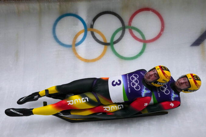 Germany's Tobias Wendl, left, and Tobias Arlt, right, slide down the track during a men's doubles luge run at the 2026 Winter Olympics, in Cortina d'Ampezzo, Italy, Wednesday, Feb. 11, 2026. Foto: SITA/AP