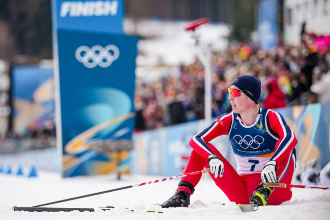 Jens Luraas Oftebro, of Norway, sits on the snow after crossing the finish line to win the Nordic Combined Individual Gundersen Normal Hill/10km competition at the 2026 Winter Olympics, in Tesero, Italy, Wednesday, Feb. 11, 2026. Foto: SITA/AP