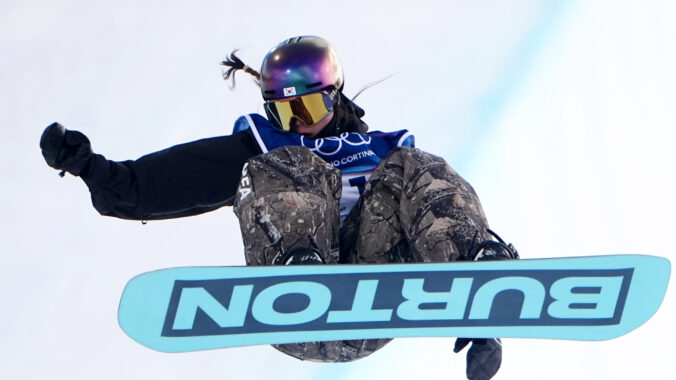 South Korea's Choi Ga-on competes during the women's snowboarding halfpipe qualifications at the 2026 Winter Olympics, in Livigno, Italy, Wednesday, Feb. 11, 2026. Foto: SITA/AP