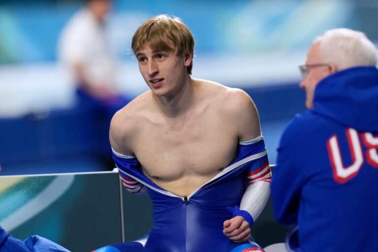 Jordan Stolz of the U.S. talks to coach Bob Corby, right, before the men's 1,000 meters speedskating race at the 2026 Winter Olympics, in Milan, Italy, Wednesday, Feb. 11, 2026. Foto: SITA/AP