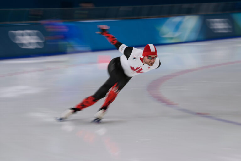 Laurent Dubreuil of Canada competes in the men's 1,000 meters speedskating race at the 2026 Winter Olympics, in Milan, Italy, Wednesday, Feb. 11, 2026. Foto: SITA/AP