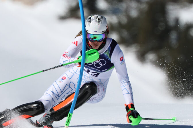 Petra Vlhová na trati počas ženského slalomového preteku v alpskom lyžovaní. Cortina d'Ampezzo, 18. február 2026. Foto: SITA/AP