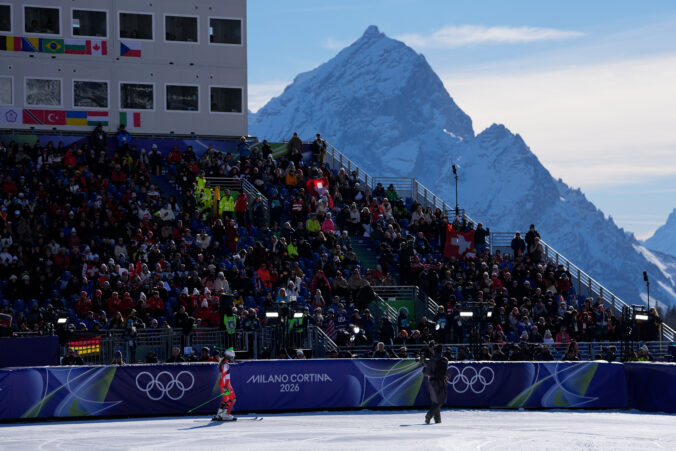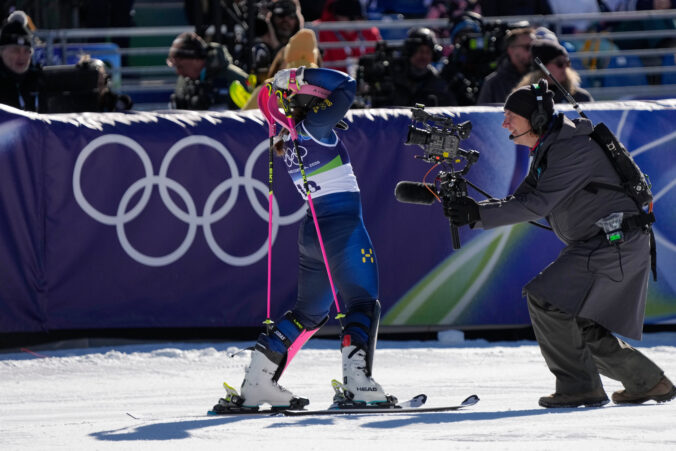 Switzerland's Camille Rast at the finish area of an alpine ski, women's slalom race, at the 2026 Winter Olympics, in Cortina d'Ampezzo, Italy, Wednesday, Feb. 18, 2026. Foto: SITA/AP
