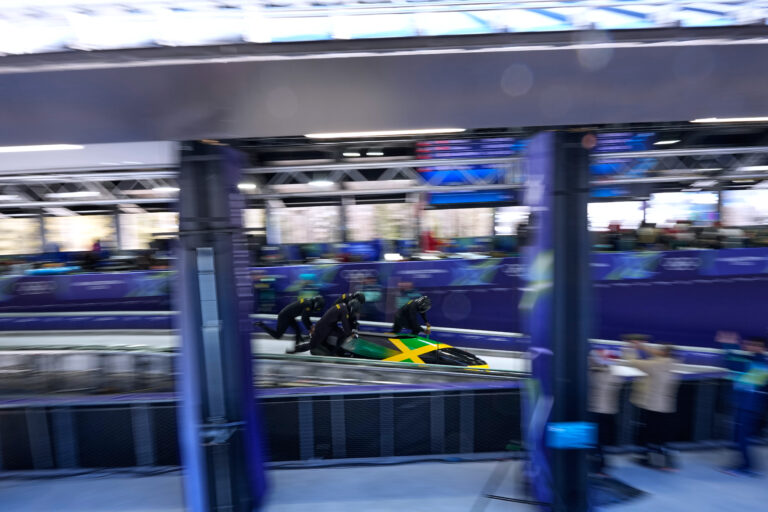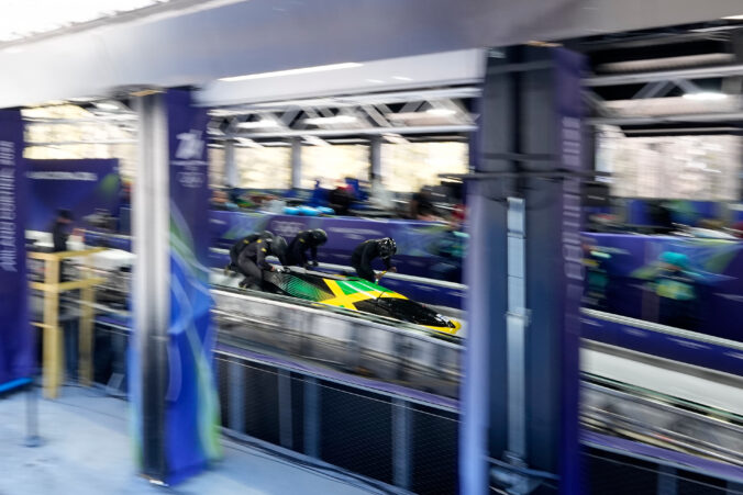 Jamaica's Shane Pitter, right, starts for a four man bobsled training session at the 2026 Winter Olympics, in Cortina d'Ampezzo, Italy, Wednesday, Feb. 18, 2026. Foto: SITA/AP