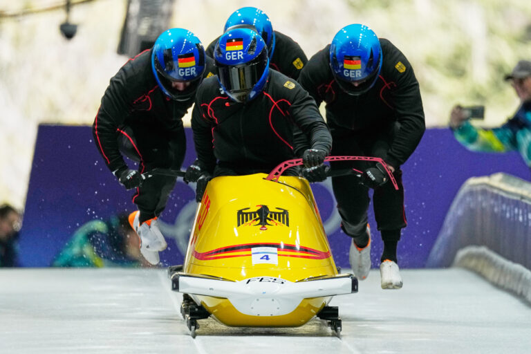 Germany's Adam Ammour, front, starts for a four man bobsled training session at the 2026 Winter Olympics, in Cortina d'Ampezzo, Italy, Wednesday, Feb. 18, 2026. Foto: SITA/AP