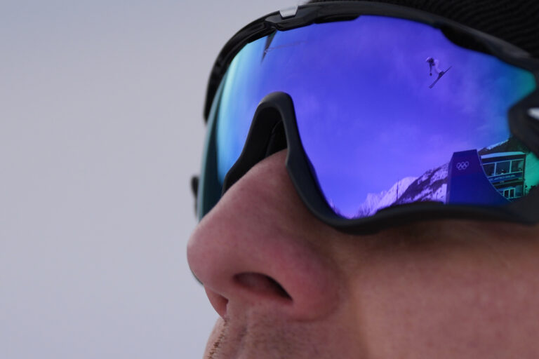 Japan's Runa Igarashi (23) is reflected in glasses as she competes during the women's freestyle skiing aerials qualifications at the 2026 Winter Olympics, in Livigno, Italy, Wednesday, Feb. 18, 2026. Foto: SITA/AP