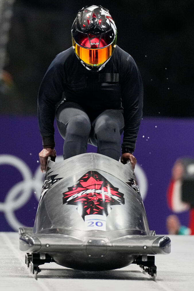 Canada's Cynthia Appiah starts for a women's monobob training session at the 2026 Winter Olympics, in Cortina d'Ampezzo, Italy, Thursday, Feb. 12, 2026. Foto: SITA/AP