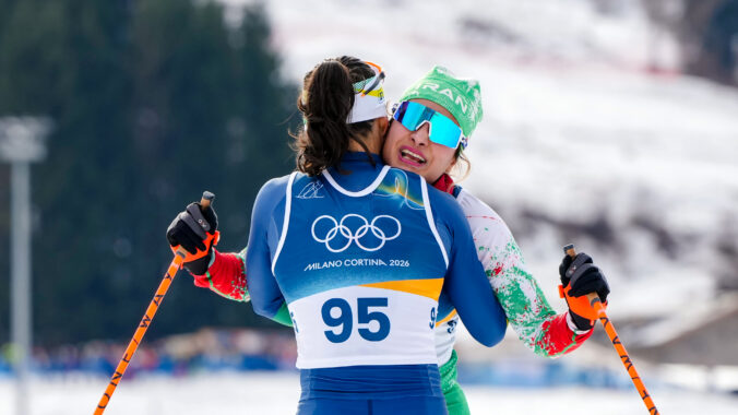 Bruna Moura, of Brazil, left, embraces Samaneh Beyrami Baher, of Iran, after she crosses the finish line in the cross country skiing women's 10km interval start free at the 2026 Winter Olympics, in Tesero, Italy, Thursday, Feb. 12, 2026. Foto: SITA/AP