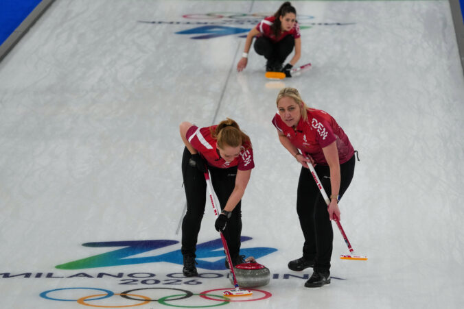 Denmark's Denise Dupont, Mathilde Halse, and Jasmin Holtermann in action during the women's curling round robin session against Japan, at the 2026 Winter Olympics, in Cortina d'Ampezzo, Italy, Thursday, Feb. 12, 2026. Foto: SITA/AP