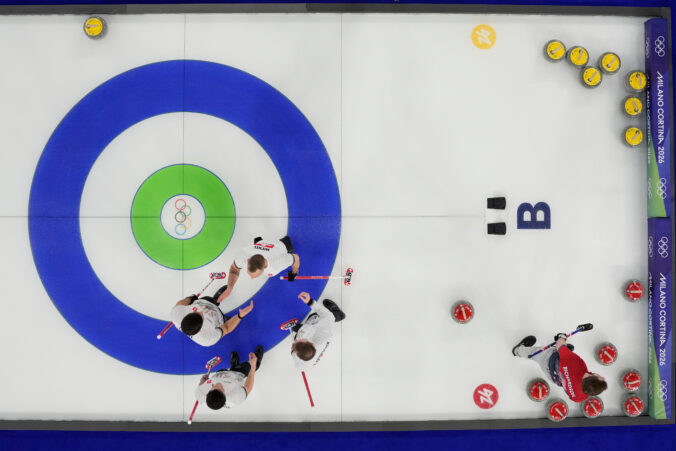 Team Switzerland celebrates after beating the United States in a men's curling round robin match at the 2026 Winter Olympics, in Cortina d'Ampezzo, Italy, Thursday, Feb. 12, 2026. Foto: SITA/AP