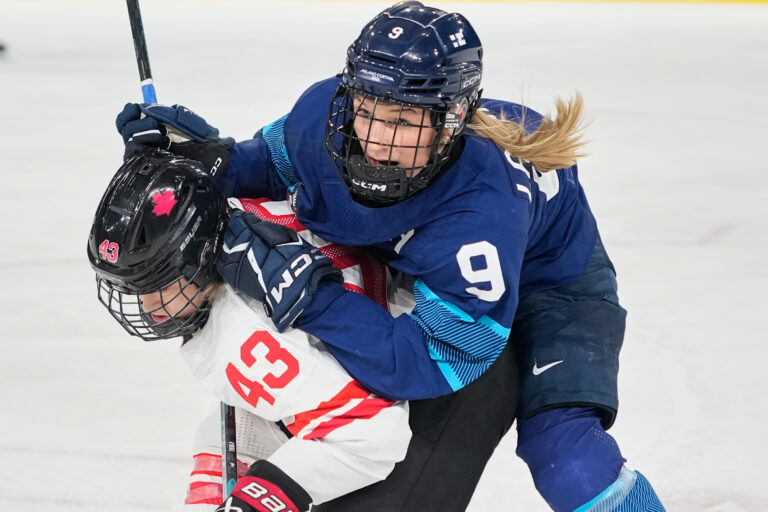 Finland's Nelli Laitinen, right, challenges Canada's Kristin O'Neill during a preliminary round match of women's ice hockey between Finland and Canada at the 2026 Winter Olympics, in Milan, Italy, Thursday, Feb. 12, 2026. Foto: SITA/AP