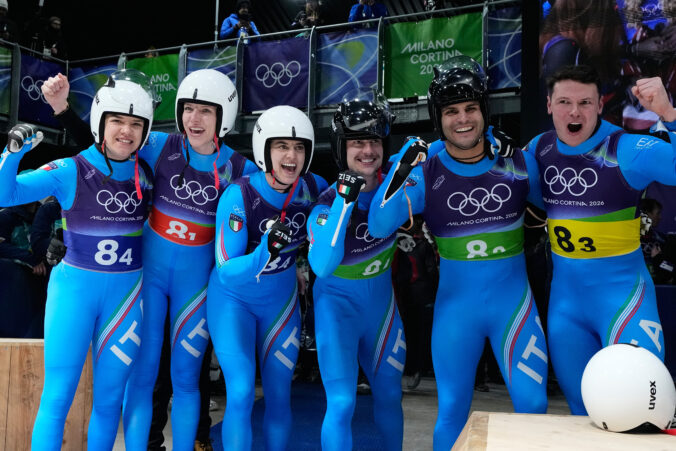 Italy's Verena Hofer, Simon Kainzwaldner, Marion Oberhofer, Andrea Voetter, Emanuel Rieder and Dominik Fischnaller celebrate during the luge relay competition at the 2026 Winter Olympics, in Cortina d'Ampezzo, Italy, Thursday, Feb. 12, 2026. Foto: SITA/AP