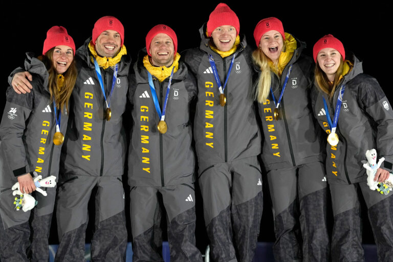 Germany's gold medalists Tobias Wendl, Tobias Arlt, Max Langenhan, Julia Taubitz, Dajana Eitberger and Magdalena Matschina pose for a photo after the luge relay competition at the 2026 Winter Olympics, in Cortina d'Ampezzo, Italy, Thursday, Feb. 12, 2026. Foto: SITA/AP