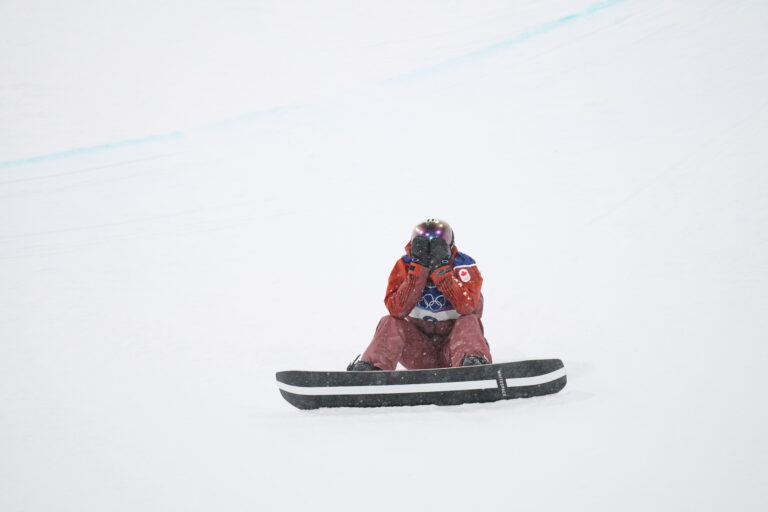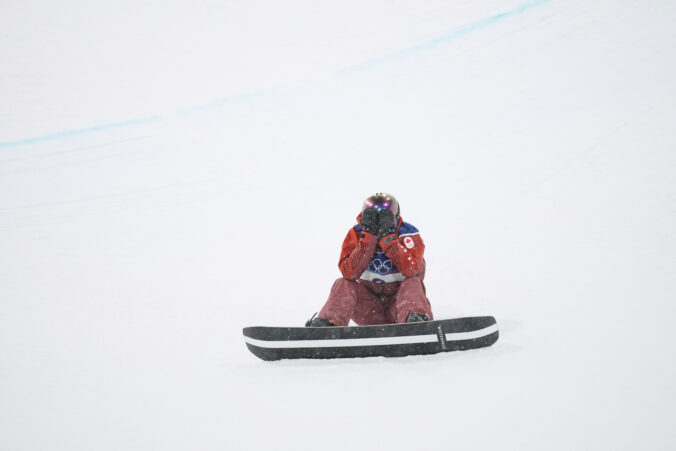 Canada's Elizabeth Hosking reacts after falling during the women's snowboarding halfpipe finals at the 2026 Winter Olympics, in Livigno, Italy, Thursday, Feb. 12, 2026. Foto: SITA/AP