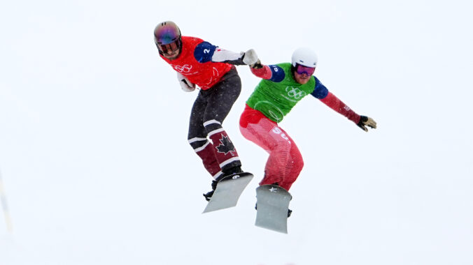 Canada's Eliot Grondin (2) and Switzerland's Kalle Koblet (15) compete during the men's snowboard cross finals at the 2026 Winter Olympics, in Livigno, Italy, Thursday, Feb. 12, 2026. Foto: SITA/AP