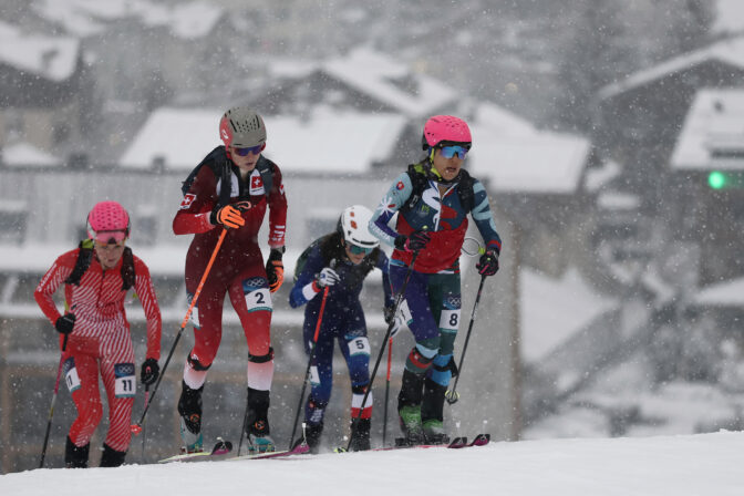 Athletes, including Italy's Alba de Silvestro, bottom left, compete during a ski mountaineering women's sprint heat, at the 2026 Winter Olympics, in Bormio, Italy, Thursday, Feb. 19, 2026. Foto: SITA/AP