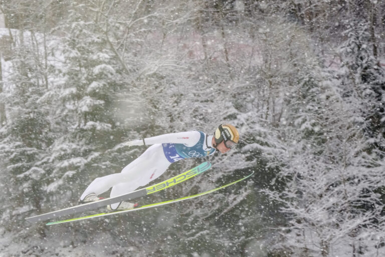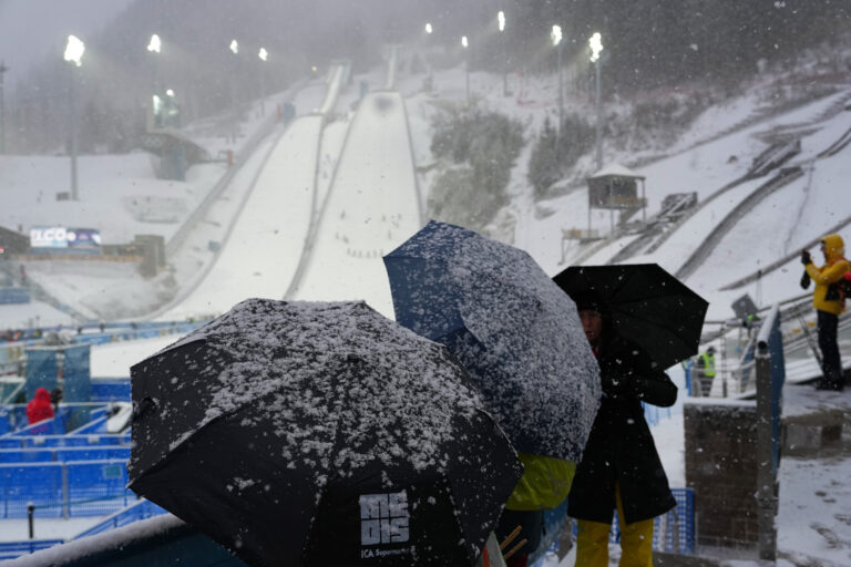 Snow falls at the ski jumping venue ahead of the nordic combined team sprint at the 2026 Winter Olympics, in Predazzo, Italy, Thursday, Feb. 19, 2026. Foto: SITA/AP
