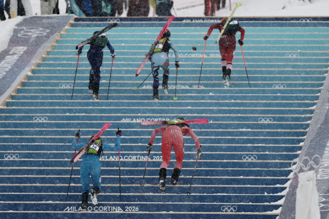 Athletes, including Italy's Alba de Silvestro, bottom left, compete during a ski mountaineering women's sprint heat, at the 2026 Winter Olympics, in Bormio, Italy, Thursday, Feb. 19, 2026. Foto: SITA/AP