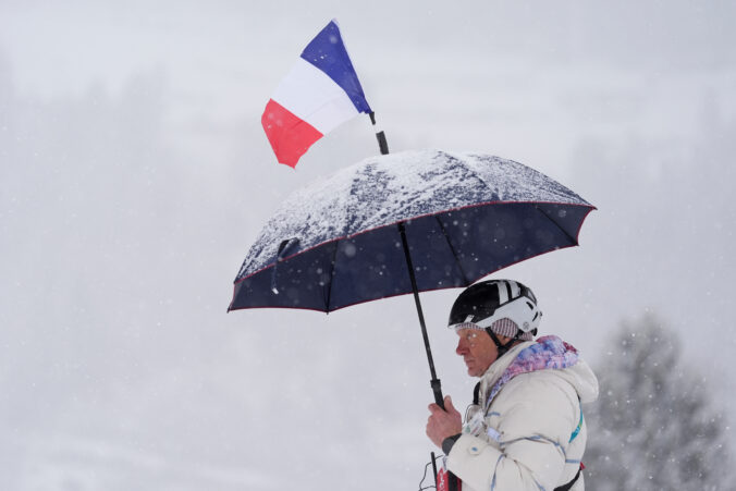 French coach Patrick Rassat shelters from a snowfall ahead of a ski mountaineering women's sprint heat, at the 2026 Winter Olympics, in Bormio, Italy, Thursday, Feb. 19, 2026. Foto: SITA/AP