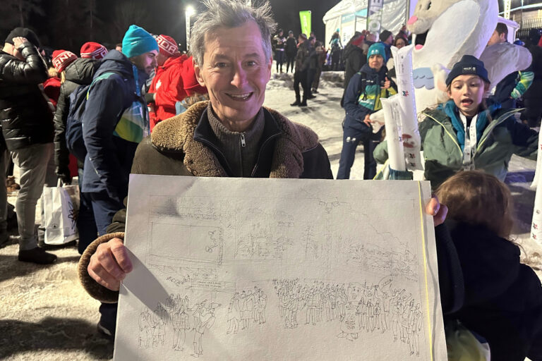 French artist Marc Ahr displays his artwork after drawing the scene at the women’s singles luge event, during the 2026 Winter Olympics, in Cortina d'Ampezzo, Italy, Monday, Feb. 9, 2026. Foto: SITA/AP