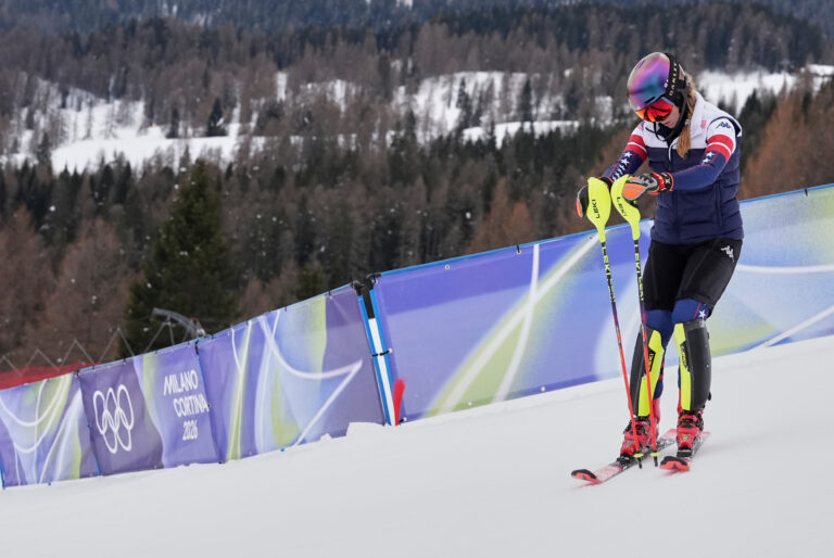 United States' Mikaela Shiffrin concentrates ahead of an alpine ski, women's slalom portion of a team combined race, at the 2026 Winter Olympics, in Cortina d'Ampezzo, Italy, Tuesday, Feb. 10, 2026. Foto: SITA/AP.