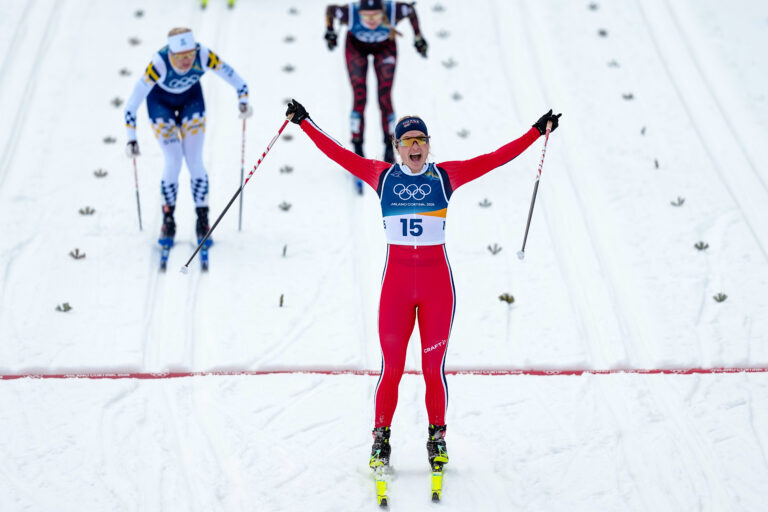 Julie Bjervig Drivenes, of Norway, reacts after crossing the finish line in a semifinal of the cross-country skiing women's sprint classic at the 2026 Winter Olympics, in Tesero, Italy, Tuesday, Feb. 10, 2026. Foto: SITA/AP.