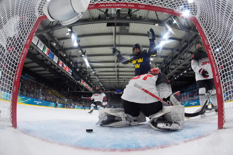 Sweden's Sofie Lundin celebrates a goal scored past Japan's Riko Kawaguchi during a preliminary round match of women's ice hockey between Japan and Sweden at the 2026 Winter Olympics, in Milan, Italy, Tuesday, Feb. 10, 2026. Foto: SITA/AP.
