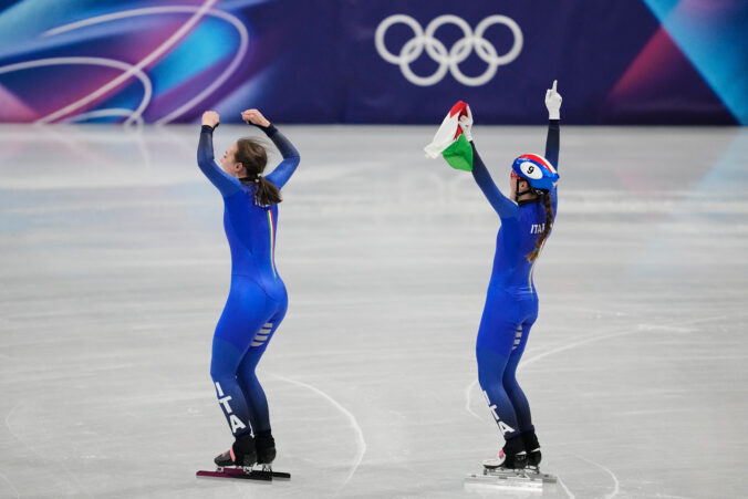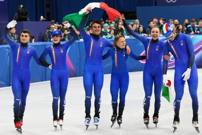 Team Italy celebrates after winning gold in the team mixed relay short track speed skating at the 2026 Winter Olympics, in Milan, Italy, Tuesday, Feb. 10, 2026. Foto: SITA/AP.