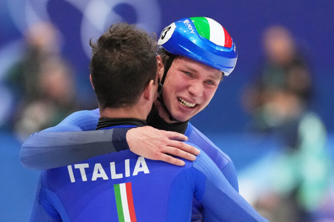 Thomas Nadalini of Italy gets emotional after Team Italy takes the gold in the team mixed relay short track speed skating at the 2026 Winter Olympics, in Milan, Italy, Tuesday, Feb. 10, 2026. Foto: SITA/AP.