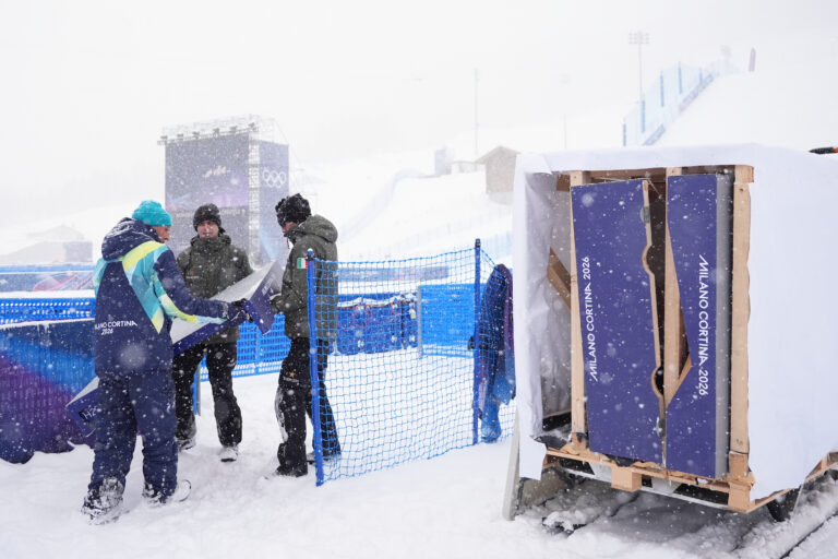 Workers pack up the podium during heavy snow at the 2026 Winter Olympics, in Livigno, Italy, Tuesday, Feb. 17, 2026. Foto: SITA/AP