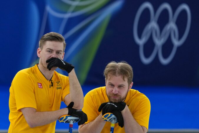 Sweden's Rasmus Wranaa, and Christoffer Sundgren, left, confer during the men's curling round robin session against Switzerland, at the 2026 Winter Olympics, in Cortina d'Ampezzo, Italy, Tuesday, Feb. 17, 2026. Foto: SITA/AP