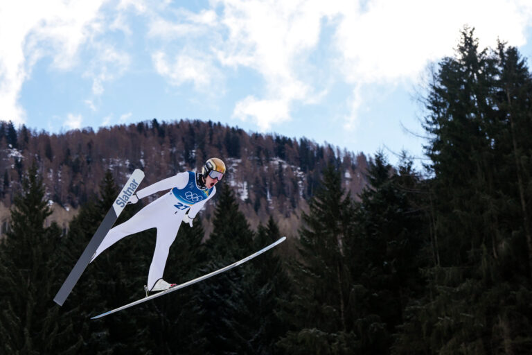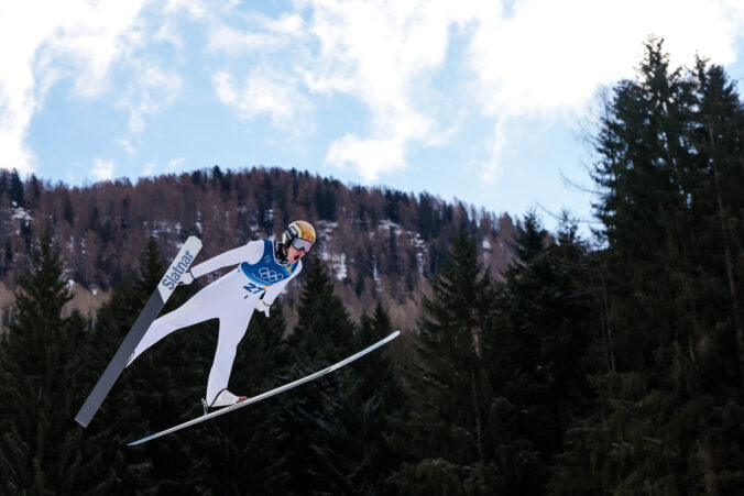 Andreas Skoglund, of Norway, soars through the air during his trial jump of the nordic combined individual Gundersen large hill/10km at the 2026 Winter Olympics, in Predazzo, Italy, Tuesday, Feb. 17, 2026. Foto: SITA/AP