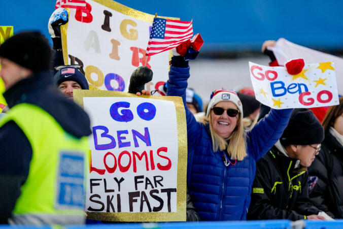 Fans hold signs supporting Benjamin Loomis, of the United States, during his competition round jump of the nordic combined individual Gundersen large hill/10km at the 2026 Winter Olympics, in Predazzo, Italy, Tuesday, Feb. 17, 2026. Foto: SITA/AP