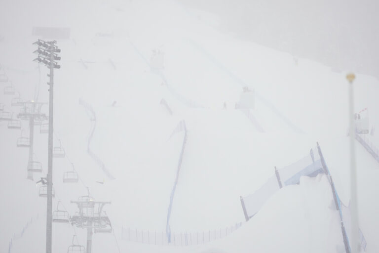 The slopestyle course is seen during heavy snow before the women's snowboarding slopestyle finals at the 2026 Winter Olympics, in Livigno, Italy, Tuesday, Feb. 17, 2026. Foto: SITA/AP