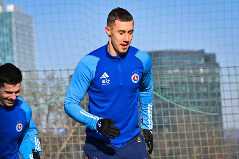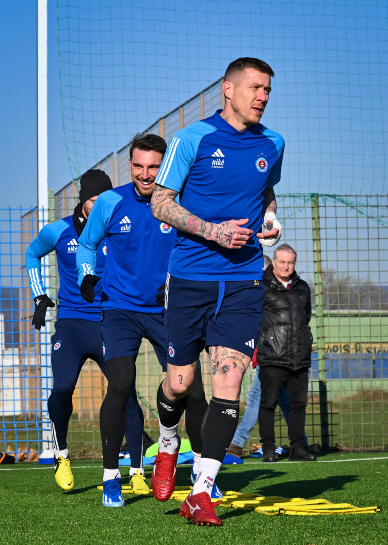 Hráč Filip Lichý (vpravo) počas prvého tohtoročného tréningu A-tímu ŠK Slovan Bratislava na umelej tráve na Pasienkoch v Bratislave. Bratislava, 10. január 2024. Foto: SITA
