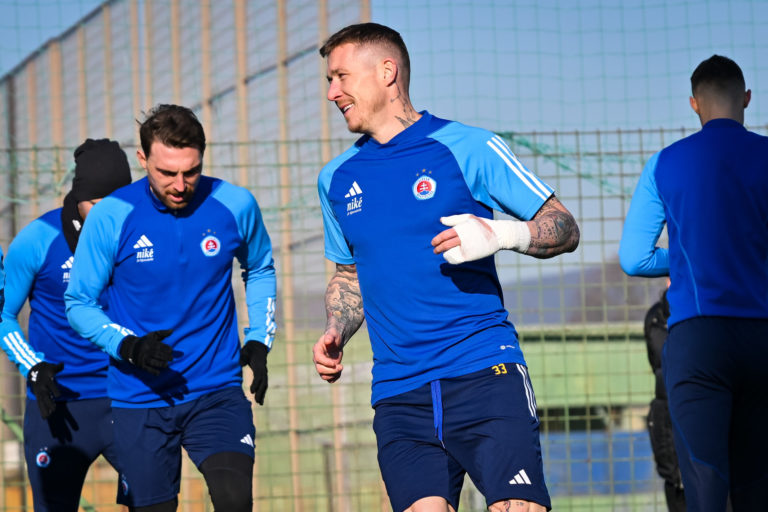 Vľavo v popredí: Hráč Juraj Kucka počas prvého tohtoročného tréningu A-tímu ŠK Slovan Bratislava na umelej tráve na Pasienkoch v Bratislave. Bratislava, 10. január 2024. Foto: SITA