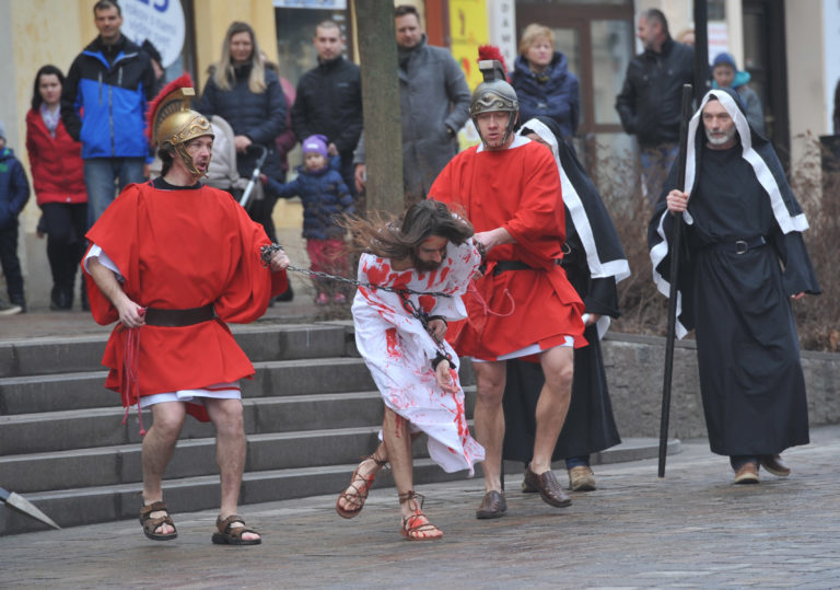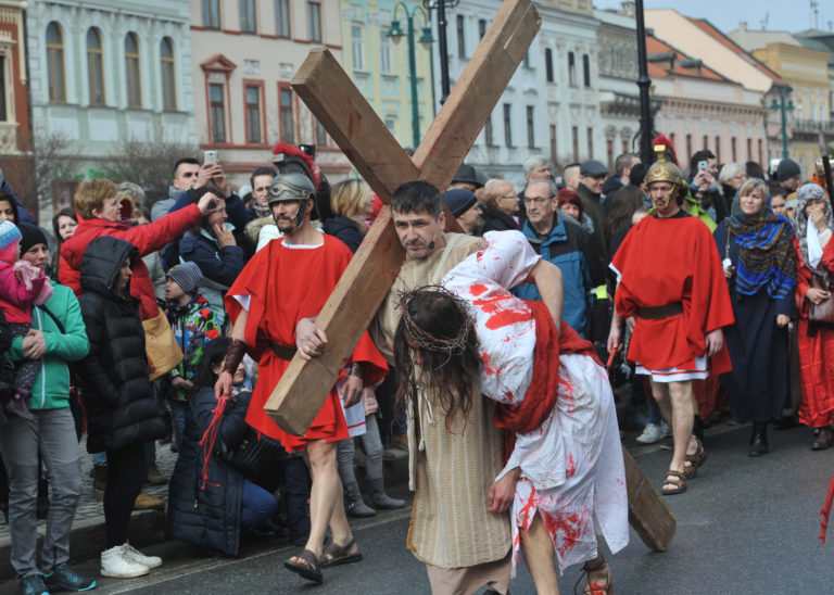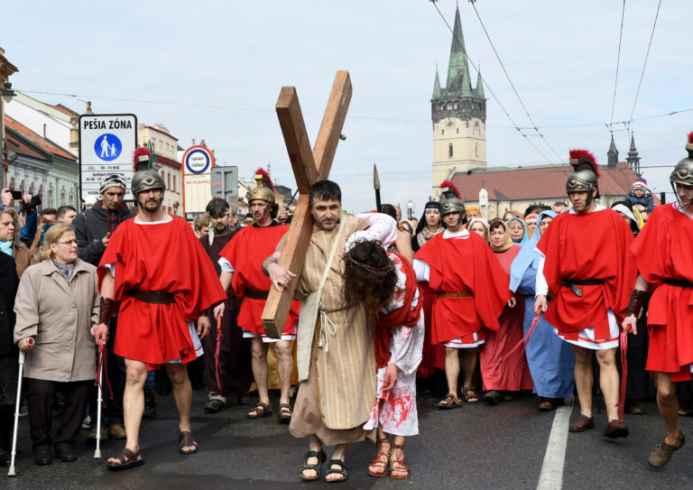 Ježiš, ktorého hrá Matúš Jurko (uprostred) počas živého zobrazenia poslednej cesty Ježiša Krista na Veľký piatok v rámci Veľkonočných sviatkov. Zobrazenia autentických zastavení Krížovej cesty začali na Hlavnej ulici a vyvrcholili ukrižovaním a pochovaním Ježiša Krista v Záhrade umenia. Prešov, 30. marec 2018. Foto: SITA/Viktor Zamborský.