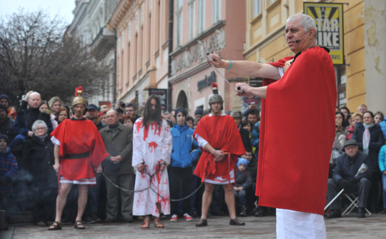 Pilát Pontský súdi Ježiša Krista počas živého zobrazenia poslednej cesty Ježiša Krista na Veľký piatok v rámci Veľkonočných sviatkov. Zobrazenia autentických zastavení Krížovej cesty začali na Hlavnej ulici a vyvrcholili ukrižovaním a pochovaním Ježiša Krista v Záhrade umenia. Prešov, 30. marec 2018. Foto: SITA/Viktor Zamborský.