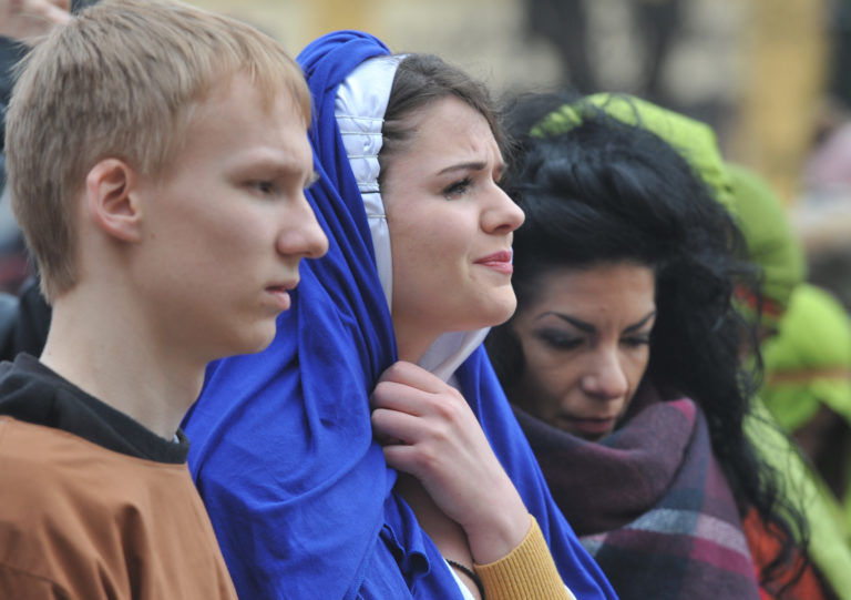 Mária, matka Ježiša, ktorú hrá Laura Krehlíková (uprosted) počas živého zobrazenia poslednej cesty Ježiša Krista na Veľký piatok v rámci Veľkonočných sviatkov. Zobrazenia autentických zastavení Krížovej cesty začali na Hlavnej ulici a vyvrcholili ukrižovaním a pochovaním Ježiša Krista v Záhrade umenia. Prešov, 30. marec 2018. Foto: SITA/Viktor Zamborský.
