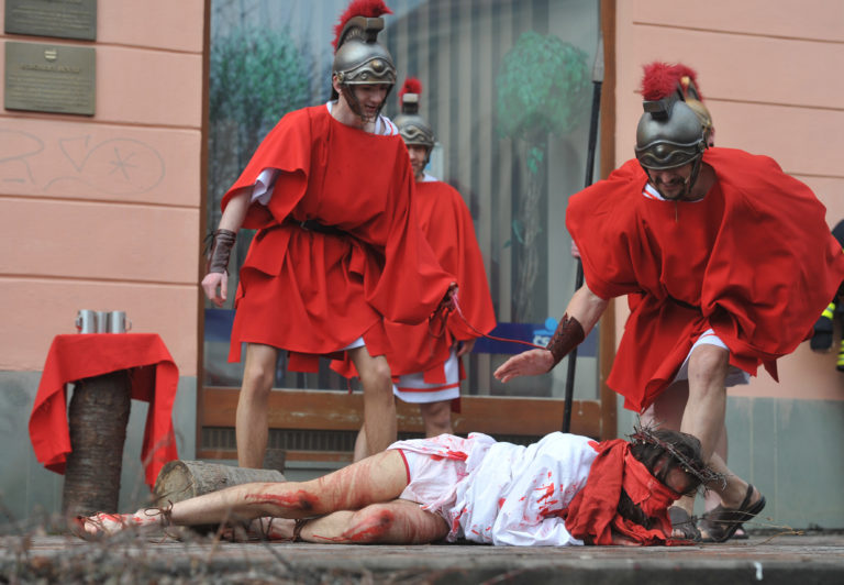 Ukrižovaný Ježiš, ktorého hrá Matúš Jurko (na zemi) počas živého zobrazenia poslednej cesty Ježiša Krista na Veľký piatok v rámci Veľkonočných sviatkov. Zobrazenia autentických zastavení Krížovej cesty začali na Hlavnej ulici a vyvrcholili ukrižovaním a pochovaním Ježiša Krista v Záhrade umenia. Prešov, 30. marec 2018. Foto: SITA/Viktor Zamborský.